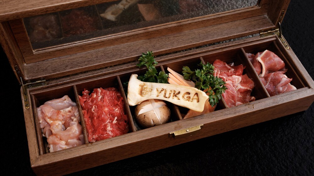 Foie gras, mangue, tobiko orange avec un coulis mangue
