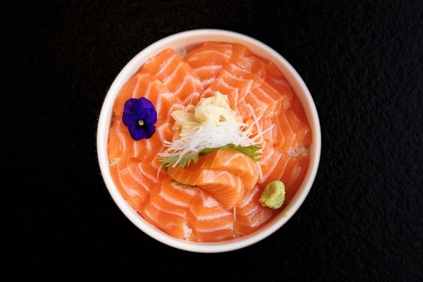 Broken slice of salmon, tempura crumble with black truffle oil and yuzu soy sauce