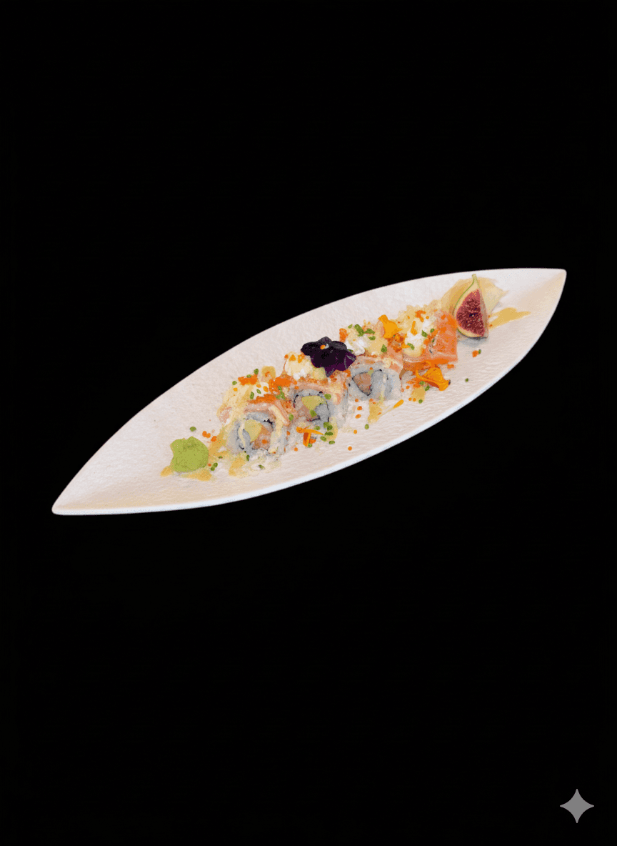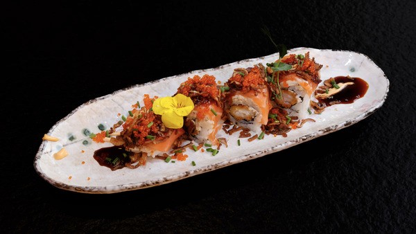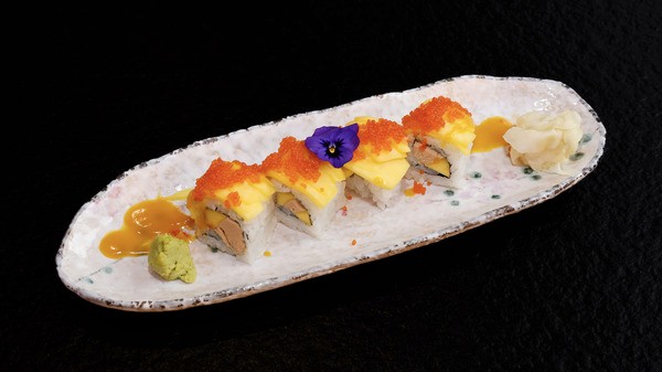 Crevette tempura, saumon, cheese, avocat, tobiko orange, oignon frit avec une sauce anguille et mayonnaise