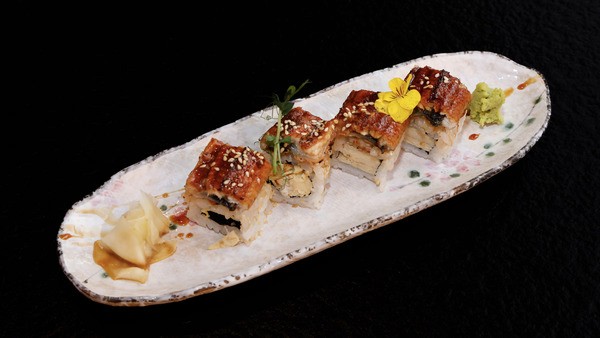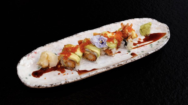 Crevette tempura, avocat, cheese, tobiko orange, sauce anguille